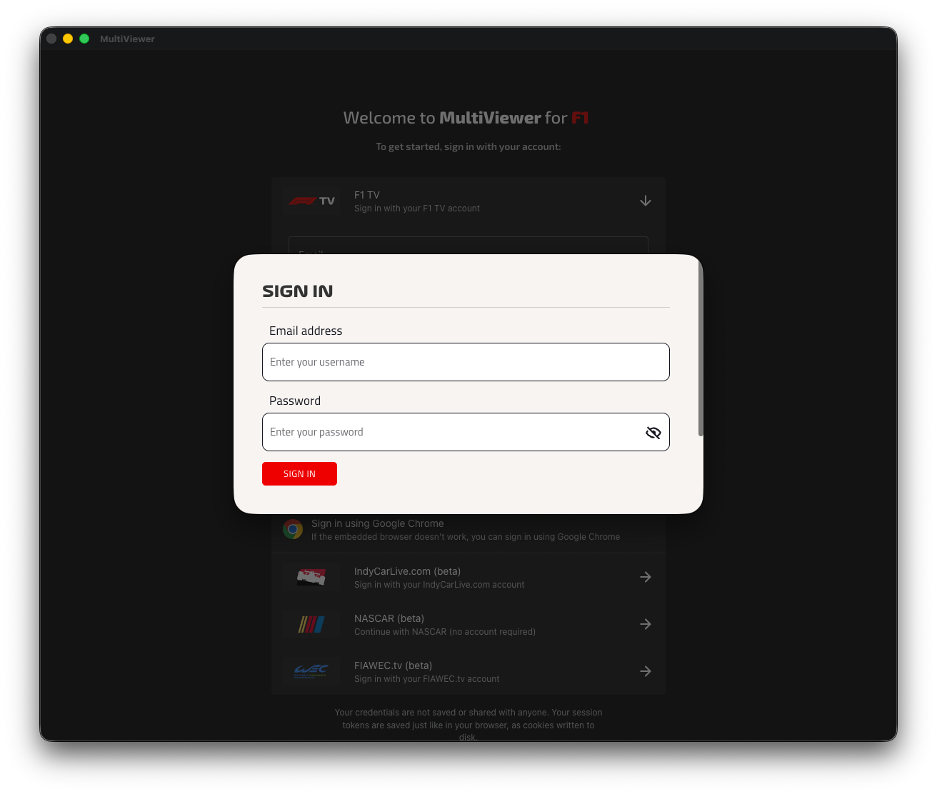 If you chose the embedded browser, the next screen will prompt you with the F1 TV sign-in form. Sign in like you normally would, and after you signed in successfully, MultiViewer will detect your session and complete the sign-in process.